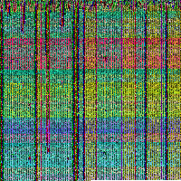 The method is described as taking all of the videos in a series and graphically xoring them using the exclusion mixing mode. The resulting composite for ♐FOND has a consistent pattern of alternating 7- and 8-bit strips (i.e. 7 pixels horizontal then 8 pixels horizontal of the same color), whereas one might expect the result to be random. This indicates the possibility there may be a file or or a message hidden in that composite.