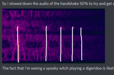 Discord user alexbassguy discovered “what appears to be a symbol in the middle” of the handshake when the sound is viewed in a waterfall sonogram: